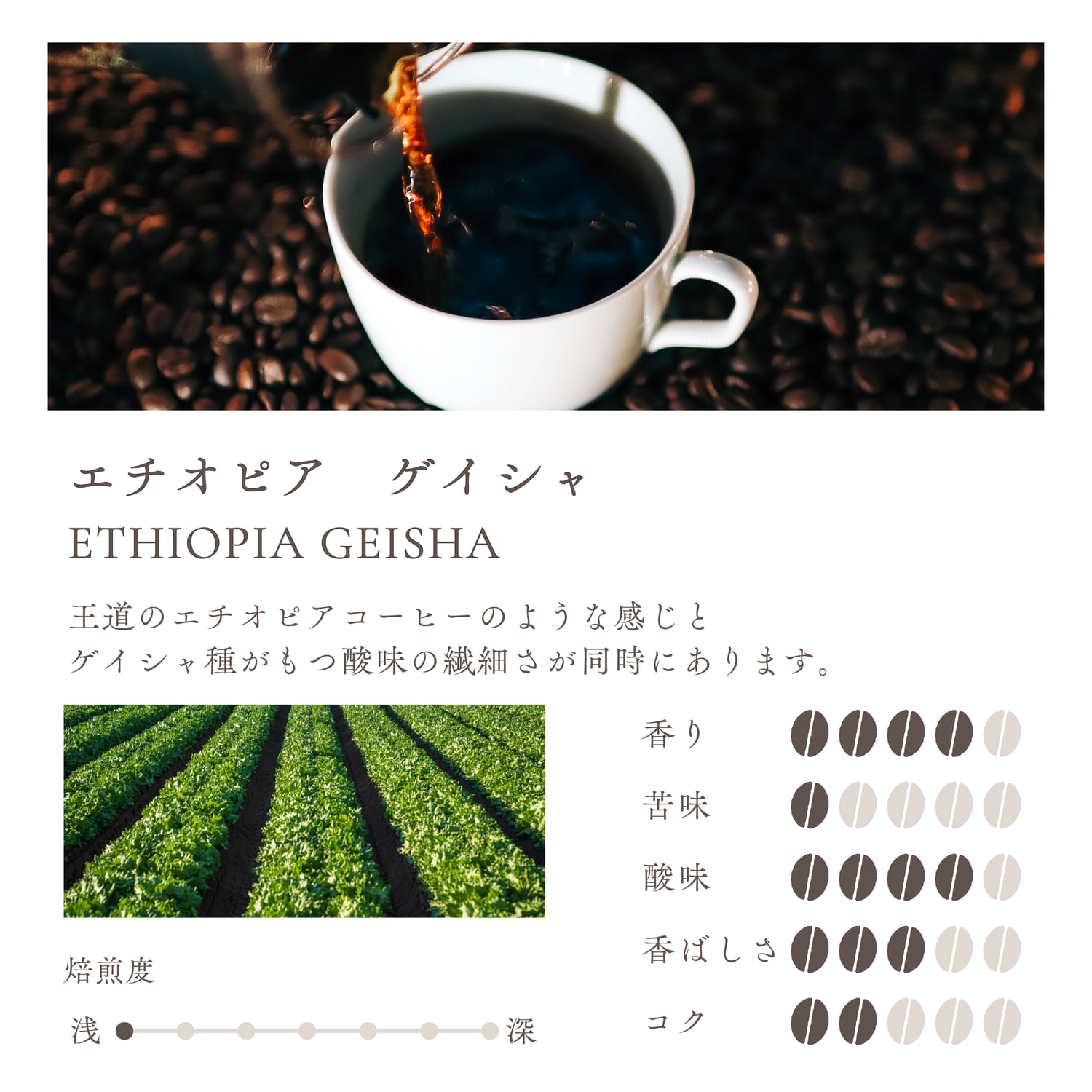 煌めくような酸味が特徴のパナマ・ゲイシャと、コーヒーらしいコクのある、優しい酸味のエチオピア・ゲイシャのセット商品です。